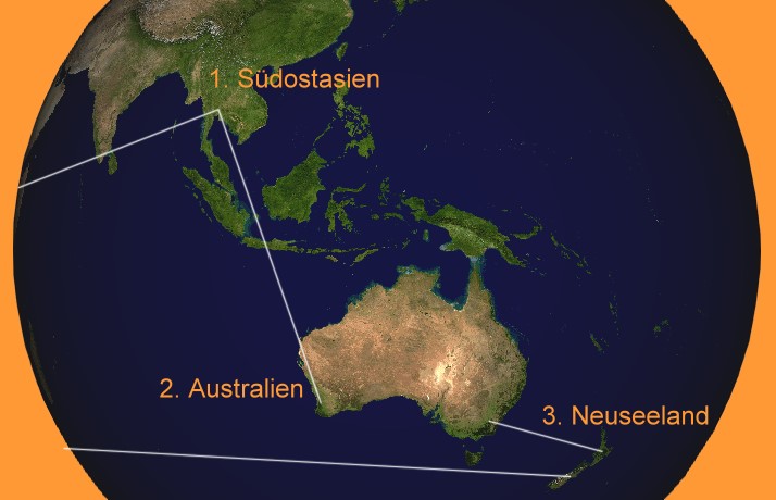 Die zweite und längste Etappe unserer Reise ist Australien. Die geplante Reiseroute verläuft von Perth an der Westküste Richtung Norden bis nach Darwin. Von dort quer durchs Landesinnere über Alice Springs bis nach Adelaide. Dann geht es weiter über Melbourne nach Tasmanien. Es folgen Canberra und Sydney.