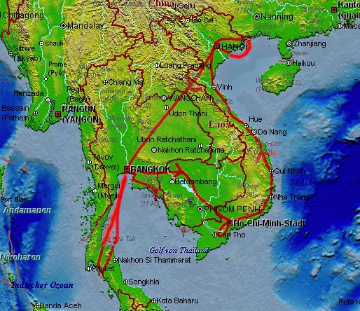 Unser nächster Stop war Ho Chi Min (früher Saigon) in Vietnam. Von hier haben wir eine Rundfahrt durch das Mekong Delta unternommen. Dann sind wir mit Bussen und Zügen in Etappen weiter Richtung Norden gefahren. Vietnam ist ein erstaunliches Land, in dem sich die Menschen, trotz der bewegten Geschichte, ihre Kultur und ihre Freundlichkeit bewahren konnten. Die französische Kolonialzeit hat positive Spuren in den Hotels und den Cafés hinterlassen. Der nördlichste Punkt unserer Reise war Halong Bay, eine mystische Landschaft schroffer Kalksteinfelsen, die aus dem Meer emporragen. Von Hanoi sind wir dann zurück nach Thailand geflogen.