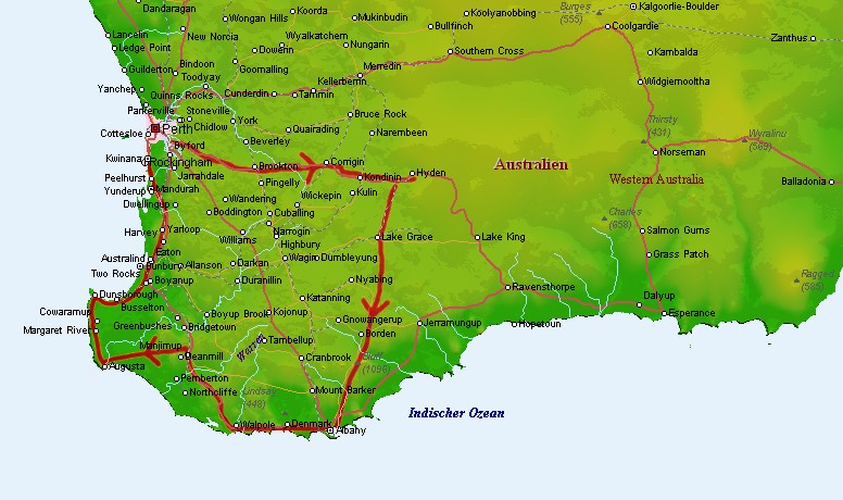 Nachdem wir zwei Wochen in Perth in einem lärmenden Backpacker gewohnt haben, ohne Auto an die Stadt gefesselt waren und dabei von den Weiten Australiens träumten, ging es jetzt endlich los. Alles war organisiert, gepackt und eingeladen. Zunächst haben wir eine kleine Runde (3000 km) durch den Südwesten gedreht.